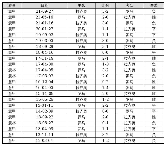 罗马 VS 拉齐奥两队近10年的交战次数为23场,罗马9胜6平8负,赢球概率为39.1%,平局概率为26.1%,输球概率为34.8%。