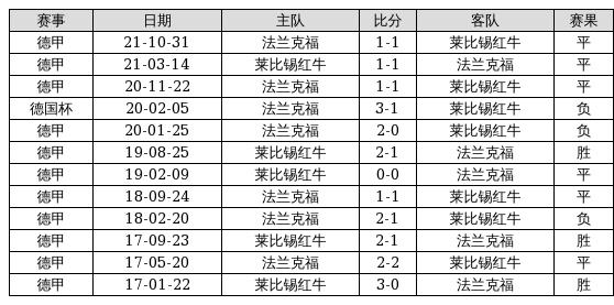 莱比锡红牛 VS 法兰克福两队近10年的交战次数为12场,莱比锡红牛3胜6平3负,赢球概率为25%,平局概率为50%,输球概率为25%。