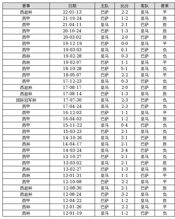 皇马 VS 巴萨两队近10年的交战次数为33场,皇马13胜8平12负,赢球概率为39.4%,平局概率为24.2%,输球概率为36.4%。