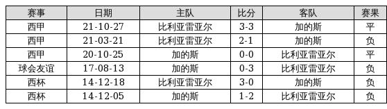 加的斯 VS 比利亚雷亚尔两队近10年的交战次数为6场,加的斯0胜2平4负,赢球概率为0%,平局概率为33.3%,输球概率为66.7%。
