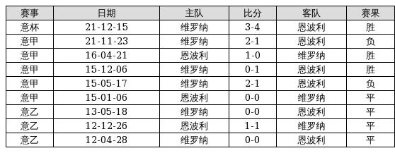 恩波利 VS 维罗纳两队近10年的交战次数为9场,恩波利3胜4平2负,赢球概率为33.3%,平局概率为44.4%,输球概率为22.2%。