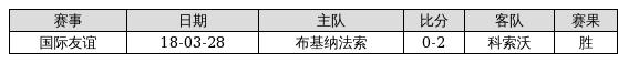 科索沃 VS 布基纳法索两队近10年的交战次数为1场,科索沃1胜0平0负,赢球概率为100%,平局概率为0%,输球概率为0%。