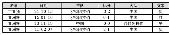 中国 VS 沙特阿拉伯两队近10年的交战次数为4场,中国1胜1平2负,赢球概率为25%,平局概率为25%,输球概率为50%。