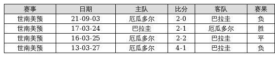 巴拉圭 VS 厄瓜多尔两队近10年的交战次数为4场,巴拉圭1胜1平2负,赢球概率为25%,平局概率为25%,输球概率为50%。