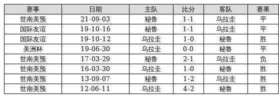 乌拉圭 VS 秘鲁两队近10年的交战次数为8场,乌拉圭4胜3平1负,赢球概率为50%,平局概率为37.5%,输球概率为12.5%。