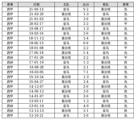 塞尔塔 VS 皇马两队近10年的交战次数为23场,塞尔塔3胜3平17负,赢球概率为13%,平局概率为13%,输球概率为73.9%。