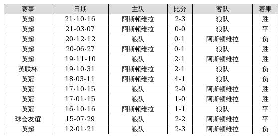 狼队 VS 阿斯顿维拉两队近10年的交战次数为12场,狼队5胜3平4负,赢球概率为41.7%,平局概率为25%,输球概率为33.3%。