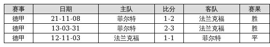 法兰克福 VS 菲尔特两队近10年的交战次数为3场,法兰克福2胜1平0负,赢球概率为66.7%,平局概率为33.3%,输球概率为0%。