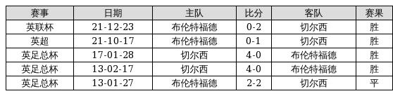 切尔西 VS 布伦特福德两队近10年的交战次数为5场,切尔西4胜1平0负,赢球概率为80%,平局概率为20%,输球概率为0%。