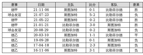 比勒菲尔德 VS 斯图加特两队近10年的交战次数为9场,比勒菲尔德3胜1平5负,赢球概率为33.3%,平局概率为11.1%,输球概率为55.6%。