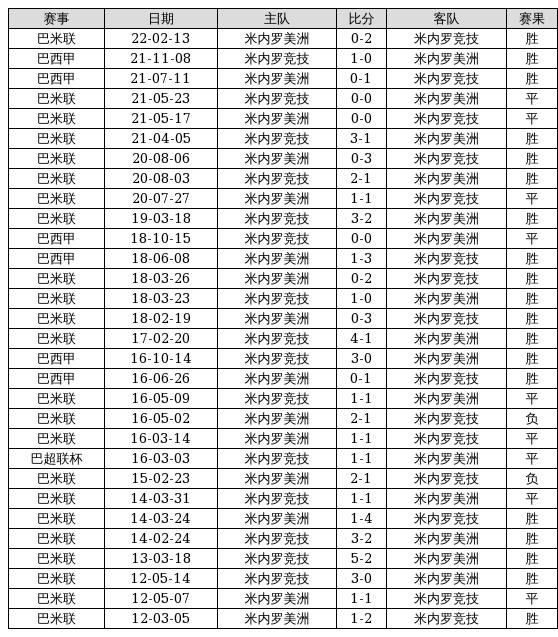 米内罗竞技 VS 米内罗美洲两队近10年的交战次数为30场,米内罗竞技19胜9平2负,赢球概率为63.3%,平局概率为30%,输球概率为6.7%。