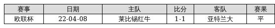 亚特兰大 VS 莱比锡红牛两队近10年的交战次数为1场,亚特兰大0胜1平0负,赢球概率为0%,平局概率为100%,输球概率为0%。