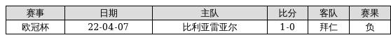 拜仁 VS 比利亚雷亚尔两队近10年的交战次数为1场,拜仁0胜0平1负,赢球概率为0%,平局概率为0%,输球概率为100%。