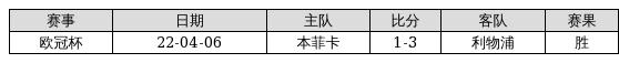 利物浦 VS 本菲卡两队近10年的交战次数为1场,利物浦1胜0平0负,赢球概率为100%,平局概率为0%,输球概率为0%。