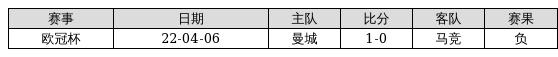 马竞 VS 曼城两队近10年的交战次数为1场,马竞0胜0平1负,赢球概率为0%,平局概率为0%,输球概率为100%。