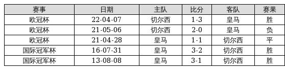 皇马 VS 切尔西两队近10年的交战次数为5场,皇马3胜1平1负,赢球概率为60%,平局概率为20%,输球概率为20%。