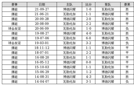 博德闪耀 VS 瓦勒伦加两队近10年的交战次数为16场,博德闪耀5胜7平4负,赢球概率为31.3%,平局概率为43.8%,输球概率为25%。