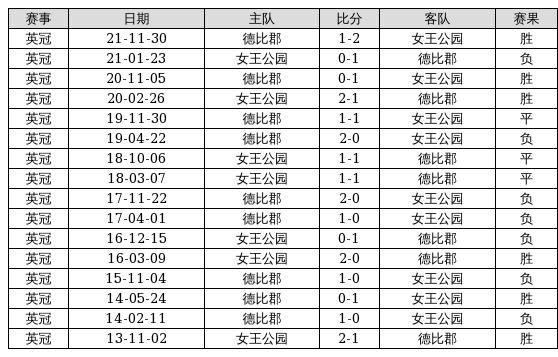 女王公园 VS 德比郡两队近10年的交战次数为16场,女王公园6胜3平7负,赢球概率为37.5%,平局概率为18.8%,输球概率为43.8%。
