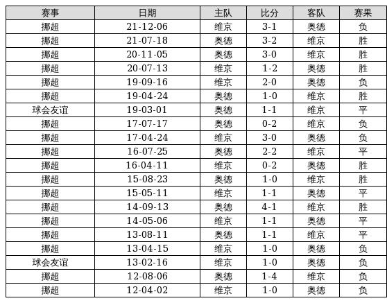 奥德 VS 维京两队近10年的交战次数为20场,奥德7胜5平8负,赢球概率为35%,平局概率为25%,输球概率为40%。