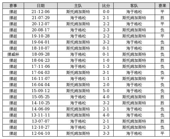 海于格松 VS 斯托姆加斯特两队近10年的交战次数为21场,海于格松6胜5平10负,赢球概率为28.6%,平局概率为23.8%,输球概率为47.6%。