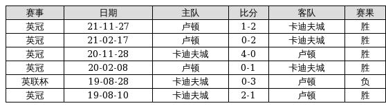 卡迪夫城 VS 卢顿两队近10年的交战次数为6场,卡迪夫城5胜0平1负,赢球概率为83.3%,平局概率为0%,输球概率为16.7%。