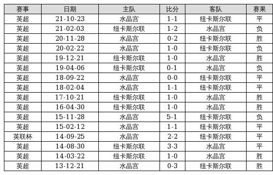 纽卡斯尔联 VS 水晶宫两队近10年的交战次数为16场,纽卡斯尔联6胜6平4负,赢球概率为37.5%,平局概率为37.5%,输球概率为25%。