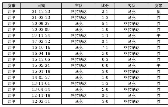 马竞 VS 格拉纳达两队近10年的交战次数为16场,马竞13胜2平1负,赢球概率为81.3%,平局概率为12.5%,输球概率为6.3%。