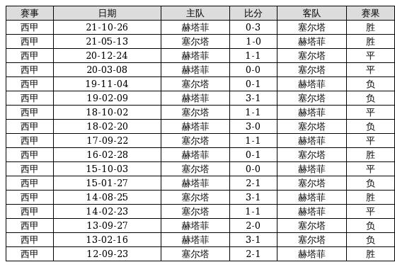 塞尔塔 VS 赫塔菲两队近10年的交战次数为17场,塞尔塔5胜6平6负,赢球概率为29.4%,平局概率为35.3%,输球概率为35.3%。