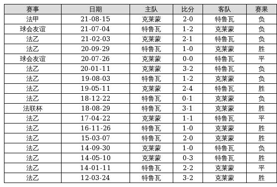 特鲁瓦 VS 克莱蒙两队近10年的交战次数为17场,特鲁瓦7胜3平7负,赢球概率为41.2%,平局概率为17.6%,输球概率为41.2%。