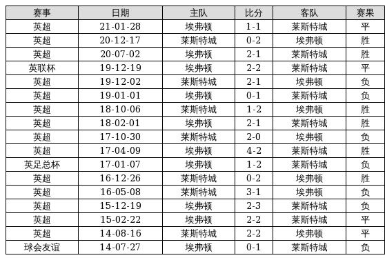 埃弗顿 VS 莱斯特城两队近10年的交战次数为17场,埃弗顿6胜4平7负,赢球概率为35.3%,平局概率为23.5%,输球概率为41.2%。