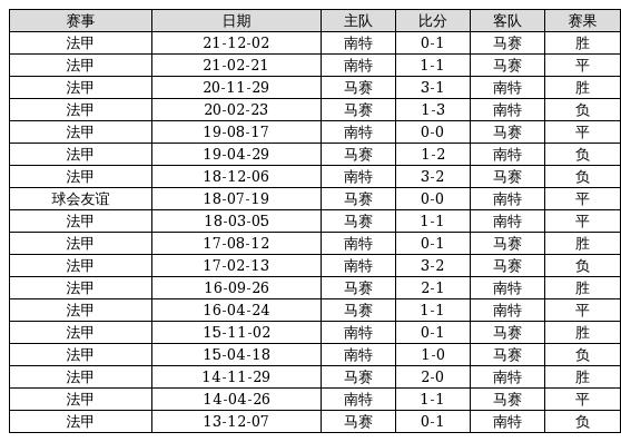 马赛 VS 南特两队近10年的交战次数为18场,马赛6胜6平6负,赢球概率为33.3%,平局概率为33.3%,输球概率为33.3%。
