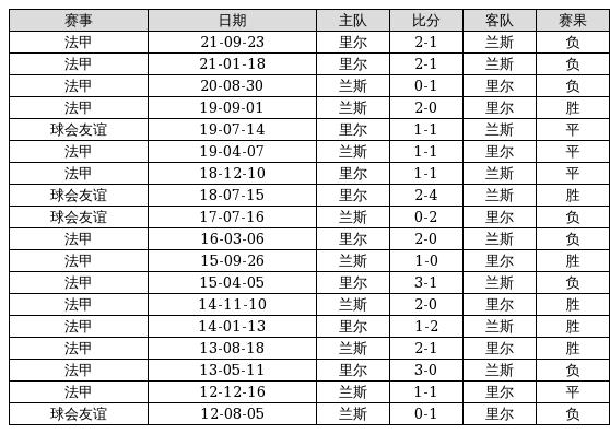 兰斯 VS 里尔两队近10年的交战次数为18场,兰斯6胜4平8负,赢球概率为33.3%,平局概率为22.2%,输球概率为44.4%。