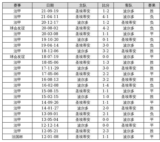 波尔多 VS 圣埃蒂安两队近10年的交战次数为23场,波尔多8胜8平7负,赢球概率为34.8%,平局概率为34.8%,输球概率为30.4%。
