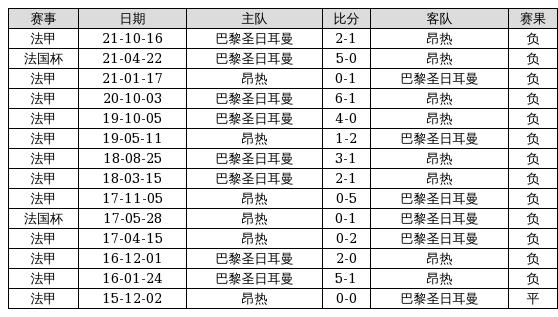 昂热 VS 巴黎圣日耳曼两队近10年的交战次数为14场,昂热0胜1平13负,赢球概率为0%,平局概率为7.1%,输球概率为92.9%。