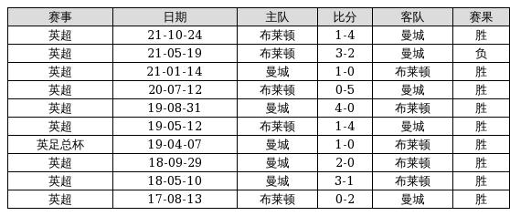 曼城 VS 布莱顿两队近10年的交战次数为10场,曼城9胜0平1负,赢球概率为90%,平局概率为0%,输球概率为10%。