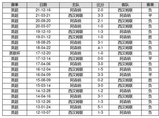 西汉姆联 VS 阿森纳两队近10年的交战次数为20场,西汉姆联2胜3平15负,赢球概率为10%,平局概率为15%,输球概率为75%。