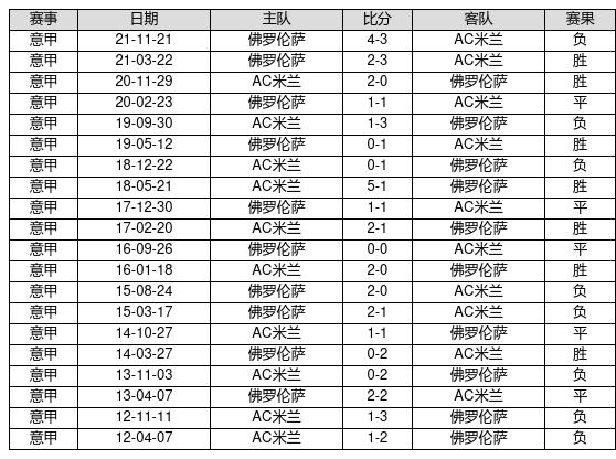 AC米兰 VS 佛罗伦萨两队近10年的交战次数为20场,AC米兰7胜5平8负,赢球概率为35%,平局概率为25%,输球概率为40%。