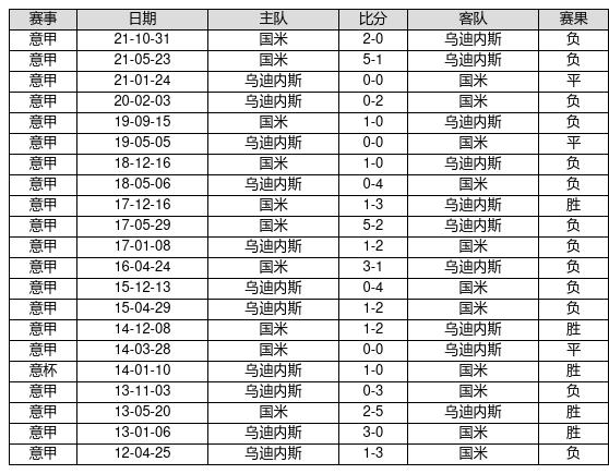 乌迪内斯 VS 国米两队近10年的交战次数为21场,乌迪内斯5胜3平13负,赢球概率为23.8%,平局概率为14.3%,输球概率为61.9%。