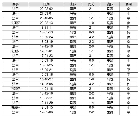 马赛 VS 里昂两队近10年的交战次数为23场,马赛2胜11平10负,赢球概率为8.7%,平局概率为47.8%,输球概率为43.5%。