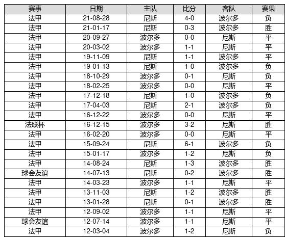 波尔多 VS 尼斯两队近10年的交战次数为23场,波尔多6胜9平8负,赢球概率为26.1%,平局概率为39.1%,输球概率为34.8%。