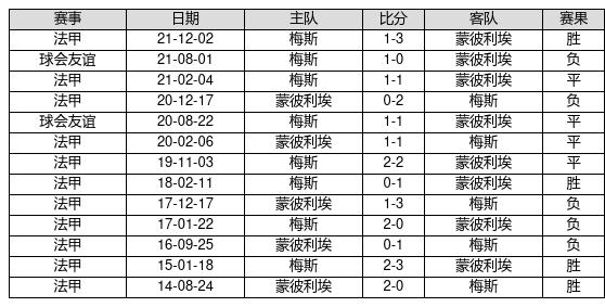 蒙彼利埃 VS 梅斯两队近10年的交战次数为13场,蒙彼利埃4胜4平5负,赢球概率为30.8%,平局概率为30.8%,输球概率为38.5%。