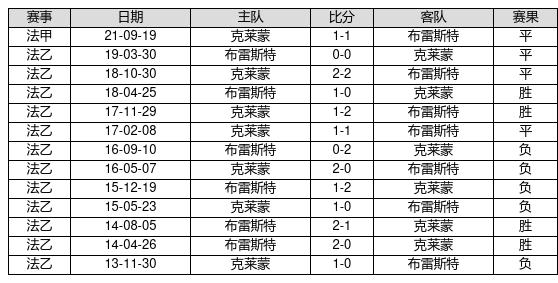 布雷斯特 VS 克莱蒙两队近10年的交战次数为13场,布雷斯特4胜4平5负,赢球概率为30.8%,平局概率为30.8%,输球概率为38.5%。