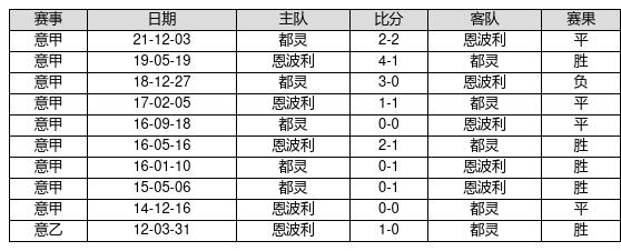 恩波利 VS 都灵两队近10年的交战次数为10场,恩波利5胜4平1负,赢球概率为50%,平局概率为40%,输球概率为10%。