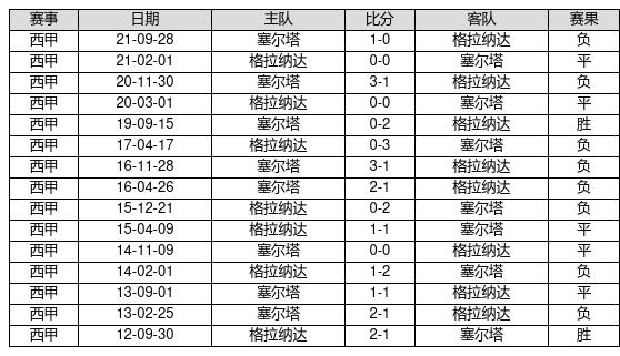 格拉纳达 VS 塞尔塔两队近10年的交战次数为15场,格拉纳达2胜5平8负,赢球概率为13.3%,平局概率为33.3%,输球概率为53.3%。