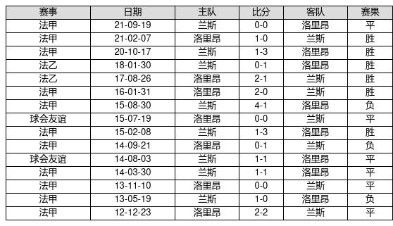 洛里昂 VS 兰斯两队近10年的交战次数为15场,洛里昂6胜6平3负,赢球概率为40%,平局概率为40%,输球概率为20%。