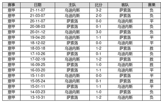 萨索洛 VS 乌迪内斯两队近10年的交战次数为17场,萨索洛4胜6平7负,赢球概率为23.5%,平局概率为35.3%,输球概率为41.2%。