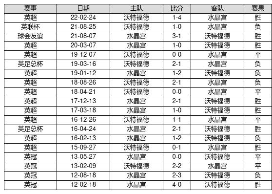 水晶宫 VS 沃特福德两队近10年的交战次数为19场,水晶宫8胜5平6负,赢球概率为42.1%,平局概率为26.3%,输球概率为31.6%。