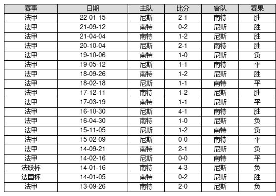 尼斯 VS 南特两队近10年的交战次数为19场,尼斯8胜5平6负,赢球概率为42.1%,平局概率为26.3%,输球概率为31.6%。