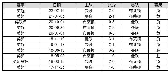 布莱顿 VS 曼联两队近10年的交战次数为11场,布莱顿2胜0平9负,赢球概率为18.2%,平局概率为0%,输球概率为81.8%。
