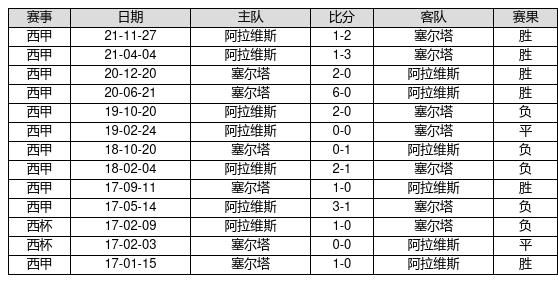 塞尔塔 VS 阿拉维斯两队近10年的交战次数为13场,塞尔塔6胜2平5负,赢球概率为46.2%,平局概率为15.4%,输球概率为38.5%。
